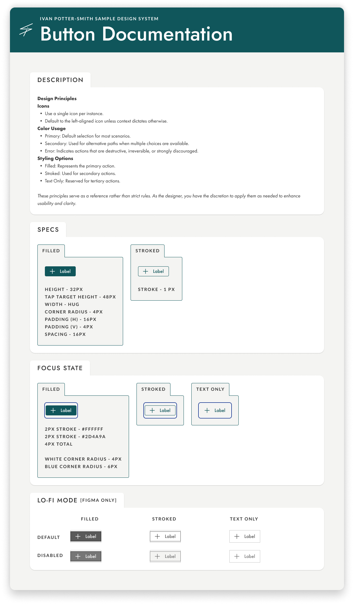 Next up it’s time to document the specs. Thanks to Figma dev mode, a lot of this is easy for devs to find already, and the written specs are more of a reference for changes occurring between different variants of components.